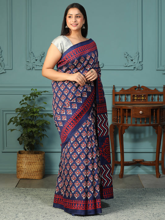 Designer block printed pure cotton mulmul Saree